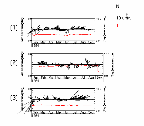 One-day current and temperature data obtained through low-pass (nearly two-day) filter. Current vectors are shown by stick diagrams. Temperatures are shown by red lines.